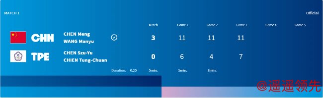 第三局,陈梦/王曼昱在1-2落后时,连下3分,以4-2反超。中国台北队叫暂停。暂停归来,陈梦/王曼昱再下2分,6-2扩大领先优势。中国台北队再追1分后,陈梦/王曼昱再下3分,以9-3领先。不过此后,中国台北队连追3分,中国队叫暂停。暂停归来,中国台北队再追1分,关键时刻,K彩平台最新登录陈梦/王曼昱再下2分,11-7再胜一局,大比分3-0(11-6/11-4/11-7)为国乒先拿一分。整场比赛仅用时20分钟。