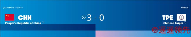 至此,头号种子中国女团以大比分3-0横扫7号种子中国台北女团,最后一个晋级半决赛。女团4强全部产生,半决赛对阵为:中国 VS 韩国;德国 VS 日本。