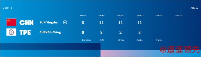 第二局,孙颖莎开局2-0领先。郑怡静追回1分后,问鼎娱乐app孙颖莎打出一波6-0,8-1领先。郑怡静再追1分后,孙颖莎连下3分,以11-2再胜一局。第三局,郑怡静开局3-0、5-1领先。此后,孙颖莎接连追成3-5、5-6。郑怡静再拿2分,8-5领先后,孙颖莎打出一波6-0,以11-8再胜一局,大比分3-0为国乒再拿一分。整场比赛用时28分钟。