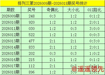 开奖回顾:排列三第2026018期奖号为:896,其奇偶比为1:2,大小比为3:0,奖号012路比为2:0:1。